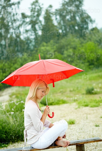 Девушка, сидящая под красным зонтом на природе