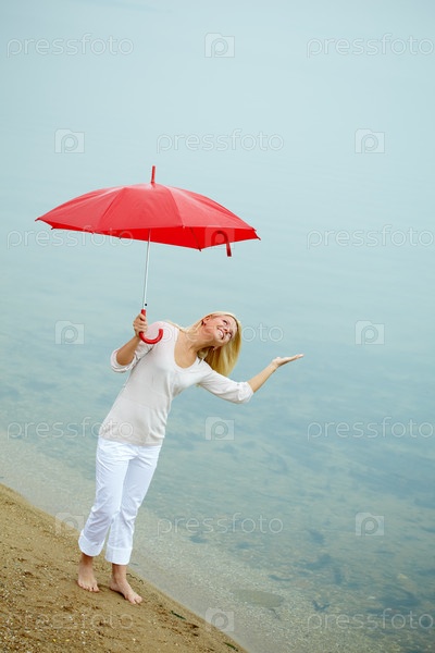 Девушка, стоящая под красным зонтом у воды