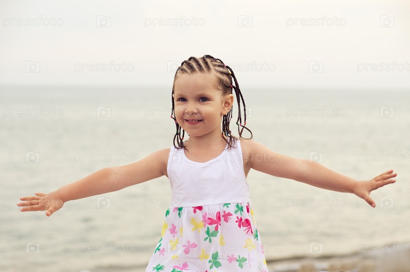 Маленькая девочка с интересной прической и вскинутыми в стороны руками