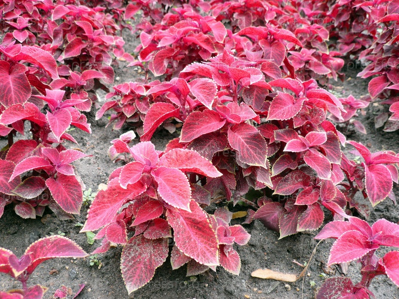 Красные листья на клумбе летом