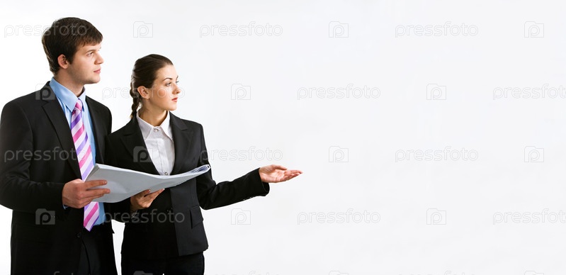 Изображение двух бизнесменов, которые держат документ и смотрят на что-то