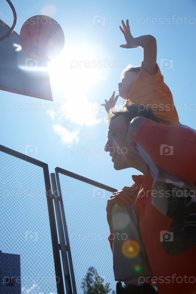 Отец с сыном играют в баскетбол