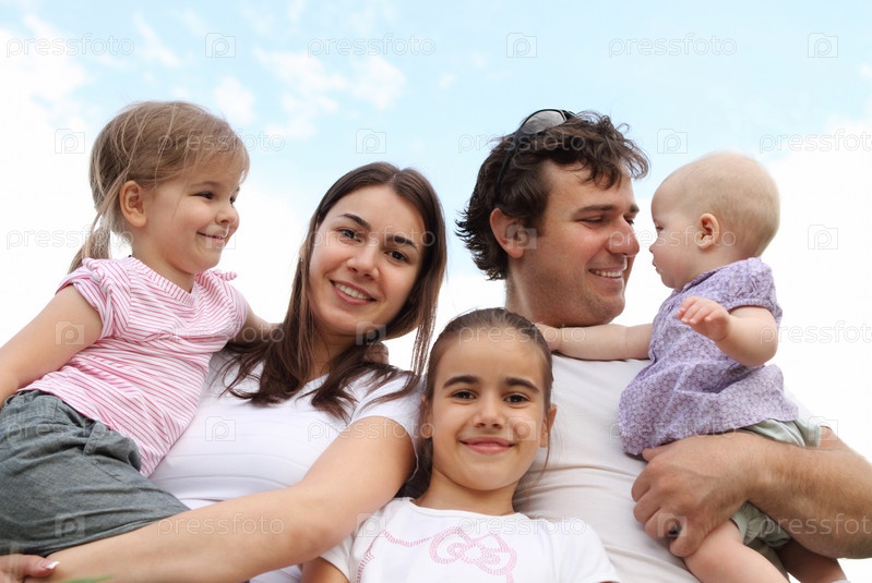 Счастливая молодая семья с тремя дочерьми на открытом воздухе