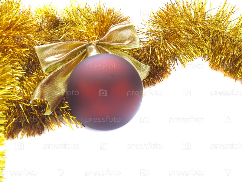 Новогодние украшения: красный шар и позолоченная мишура, изолированные на белом фоне