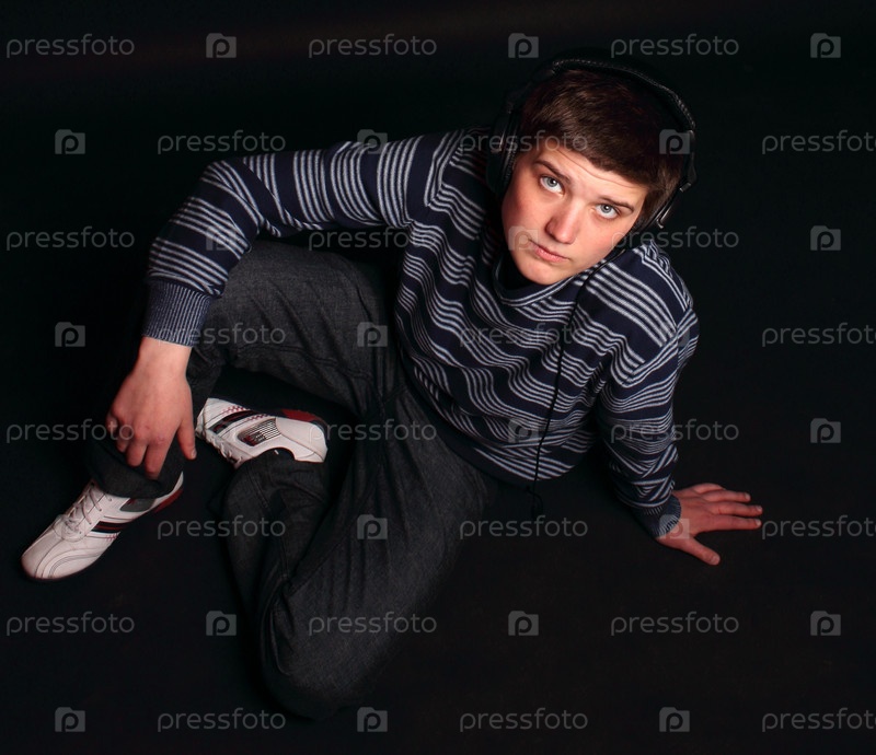 Парень слушает музыку в наушниках, сидя на полу