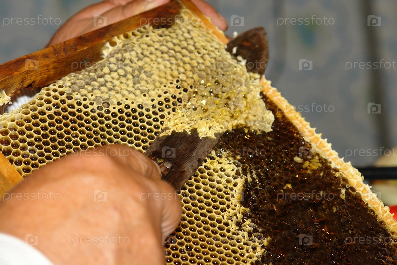 Пасечник срезает соты с рамки