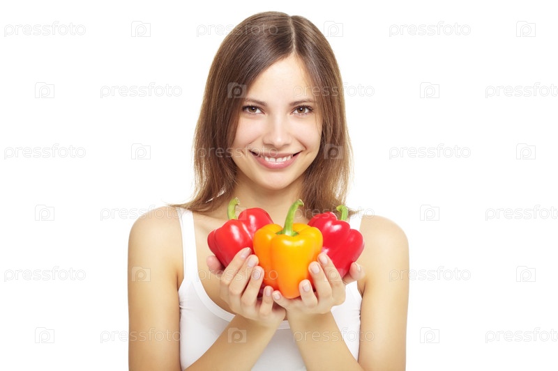 Девушка с болгарскими перцами, изолирована на белом