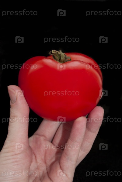 Красный помидор в руке на черном фоне