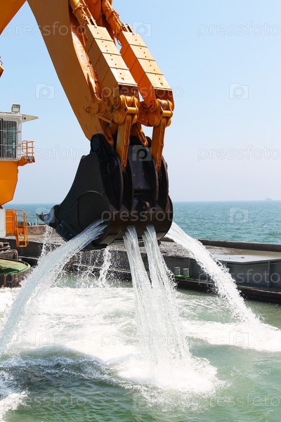 Экскаватор работает над углублением морского дна