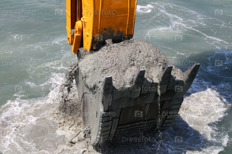 Экскаватор грузит почву с морского дна