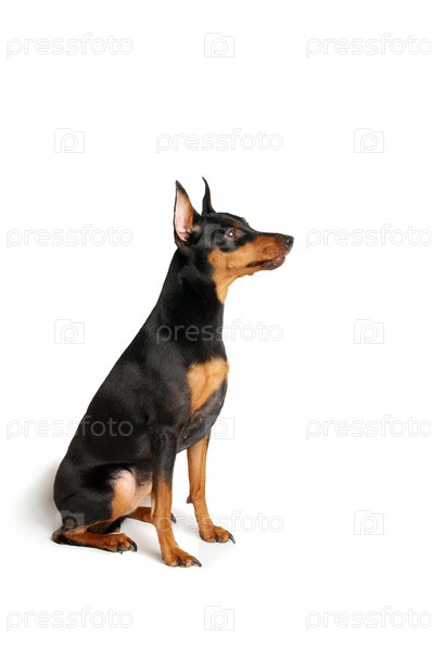 Цвергпинчер, сидящий на белом фоне