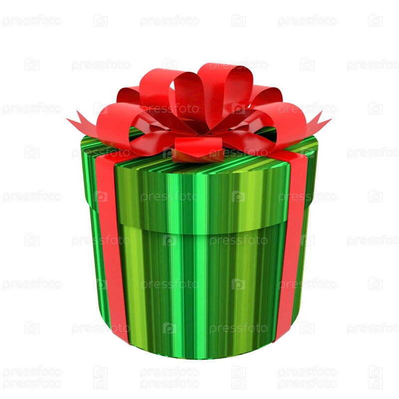 Подарок в зеленой цилиндрической коробке с красным бантом на белом фоне
