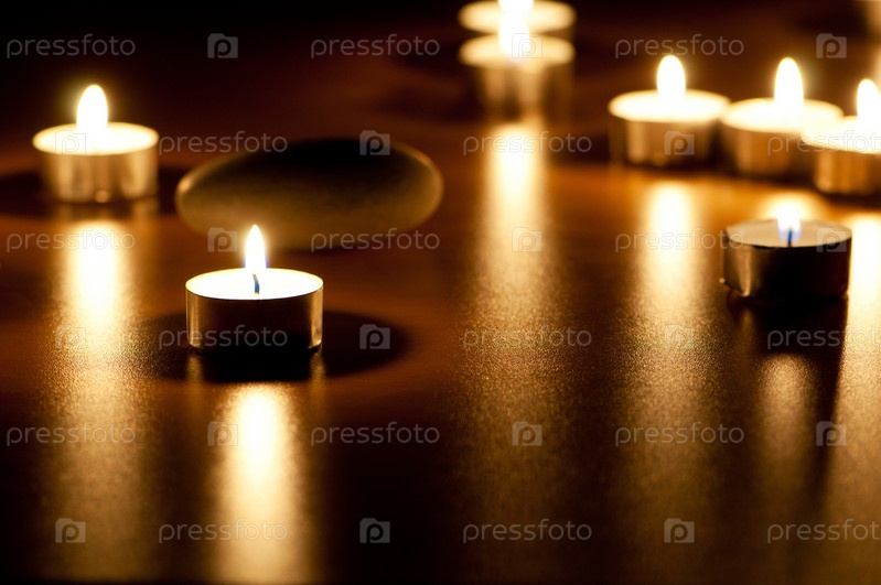 Горящие свечи и гладкий камень в темноте