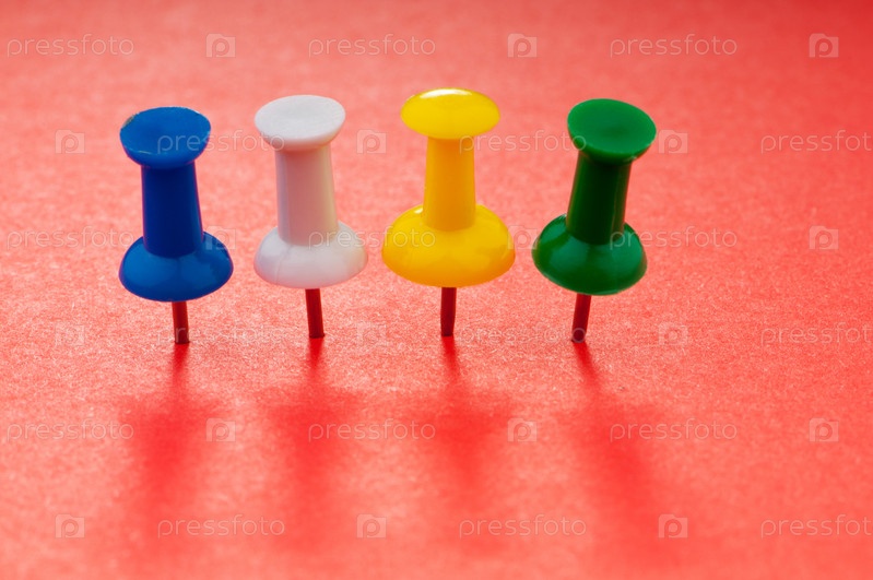 Цветные канцелярские кнопки в красной бумаге