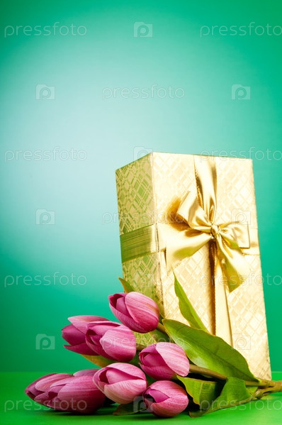 Подарок в блестящей упаковке и букет розовых тюльпанов на зеленом фоне