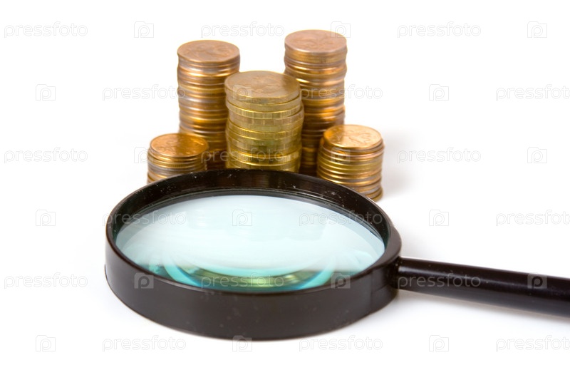 Лупа, лежащая рядом со стопкой монет