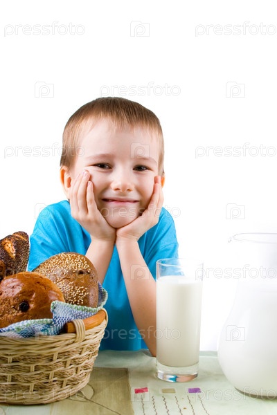 Мальчик с корзинкой хлеба и молоком на белом фоне