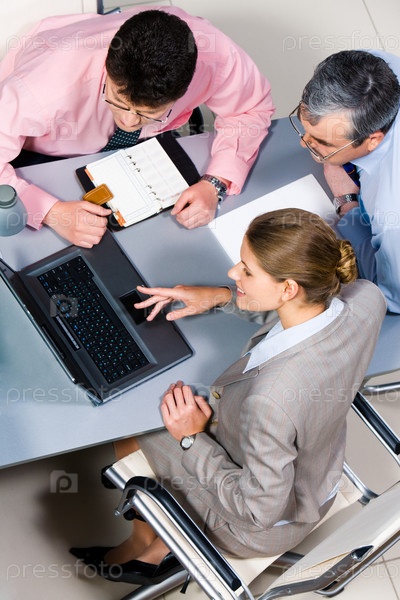 Вид трех коллег, сидящих перед ноутбуком вокруг стола и смотрящих на его экран