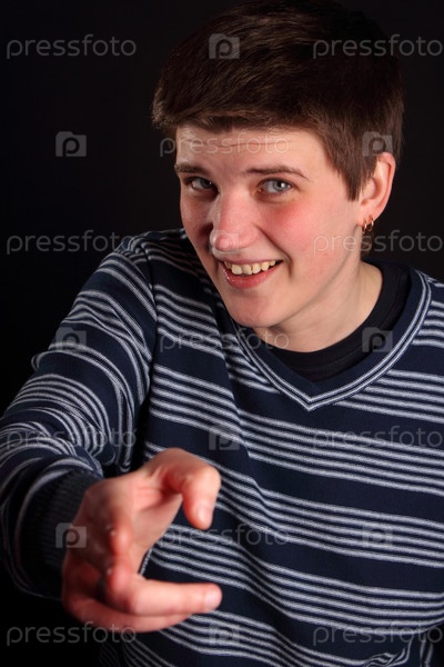 Юноша в полосатом свитере с указательным жестом, на черном фоне