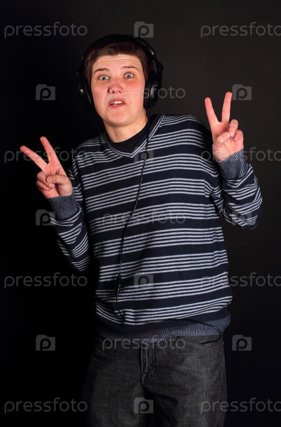 Юноша в наушниках показывает "козу", на черном фоне