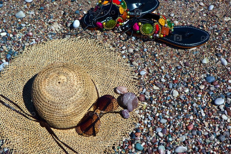 Босоножки, соломенная шляпа и солнцезащитные очки на галечном пляже