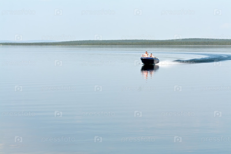 Моторная лодка плывет по озеру