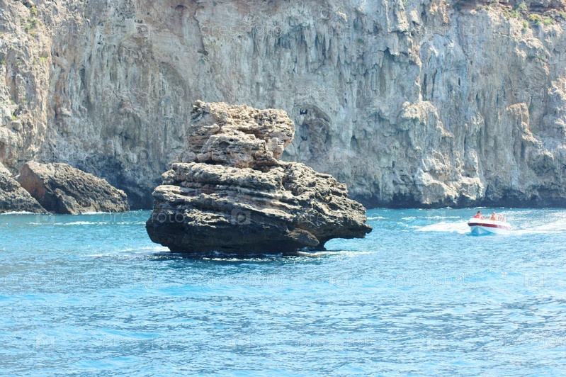 Моторная лодка на фоне скал