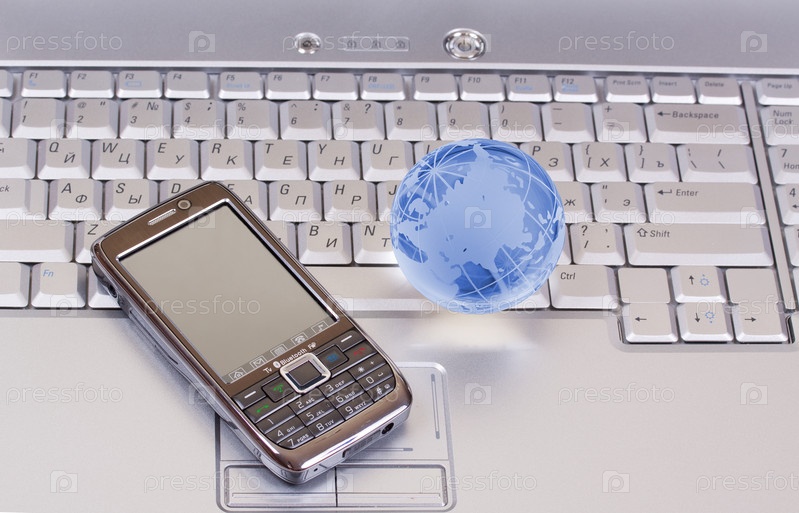 Мобильный телефон и стеклянный шар на клавиатуре ноутбука
