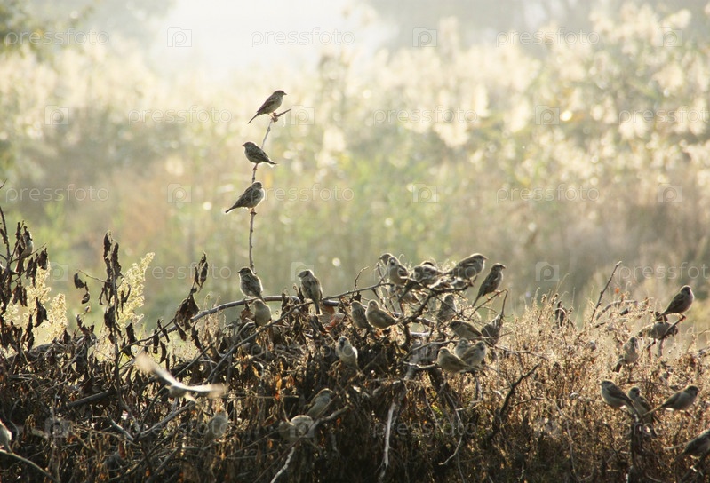 Стадо воробьев сидит на ветвях, освещенных солнечным светом
