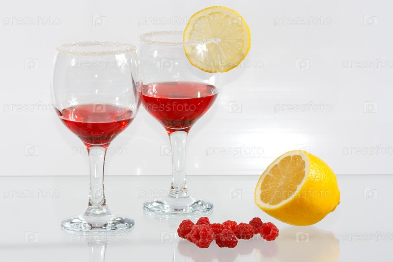 Два бокала красного вина с лимоном и малиной