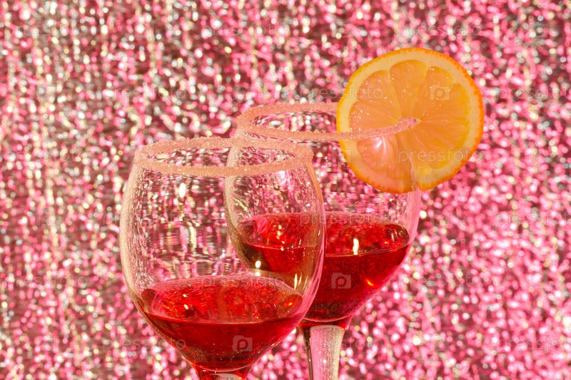 Два бокала красного вина с лимоном на фоне разноцветной фольги