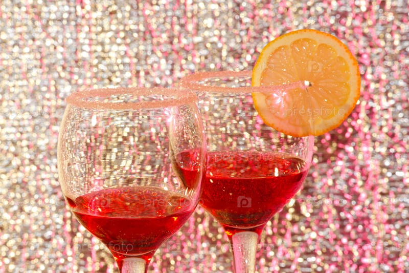 Два бокала красного вина с лимоном на фоне разноцветной фольги