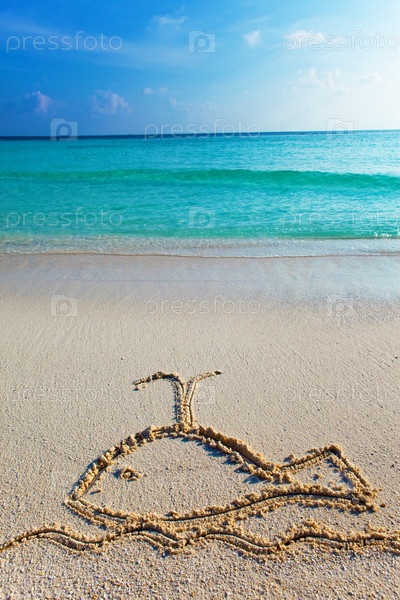Кит, нарисованный на песке на берегу океана