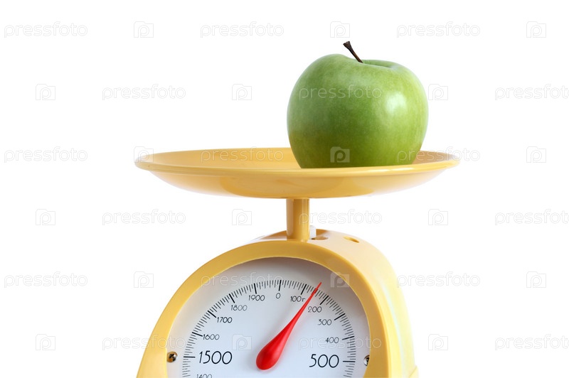 Зеленое яблоко на желтых кухонных весах на белом фоне
