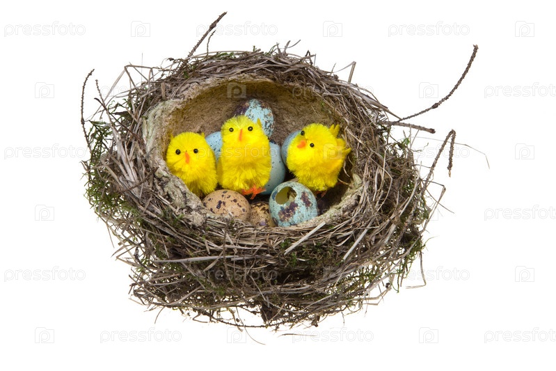 Гнездо с яйцами и птенцами на белом фоне