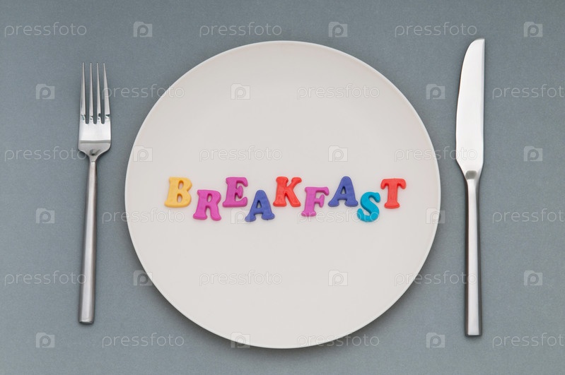 Слово "Завтрак" из цветных букв на белой тарелке и столовые приборы на сером фоне