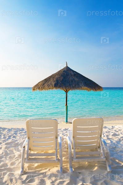 Зонтик и шезлонги на берегу океана, Мальдивы