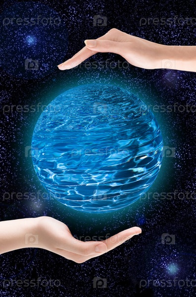 Две руки бережно держат голубую планету на фоне Вселенной