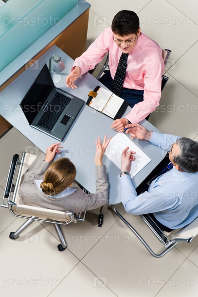 Вид сверху бизнес-команды, сидящей за столом в офисе и общающейся друг с другом