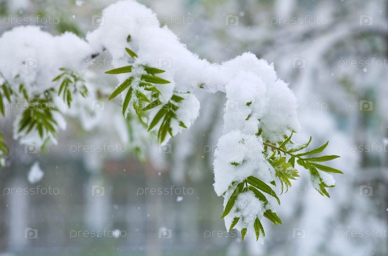 Ветки дерева с весенними листьями в снегу