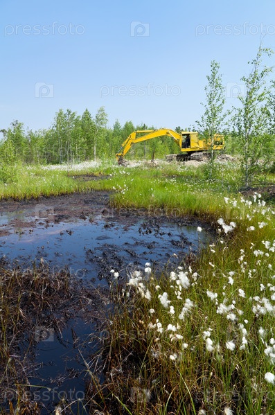 Экскаватор в лесу, устраняющий разлив нефти