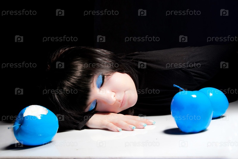 Девушка с ярким макияжем лежит, отравленная синим яблоком
