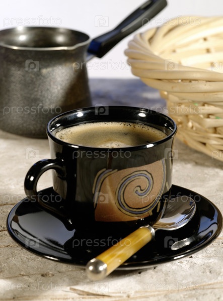 Утренний кофе, чашка эспрессо в кофейной кастрюле, небольшой синий фонарь
