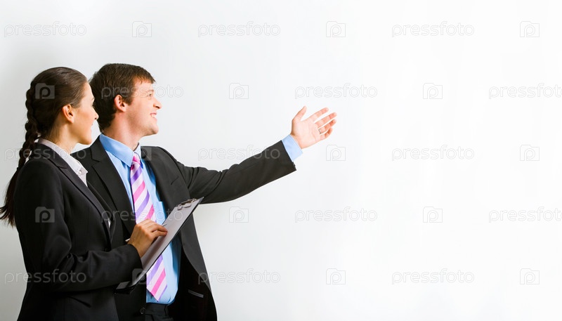 Портрет бизнесмена, указывающего на стену с помощником по соседству