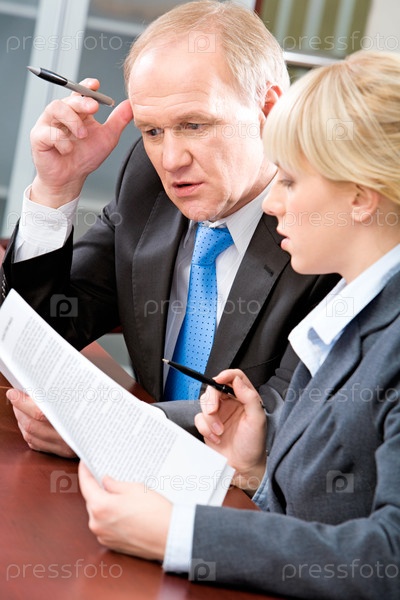 Вертикальное изображение деловых коллег, сидящих за столом и размышляющих над бизнес-документами в офисе