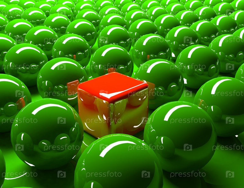 Красный куб среди зеленых шаров