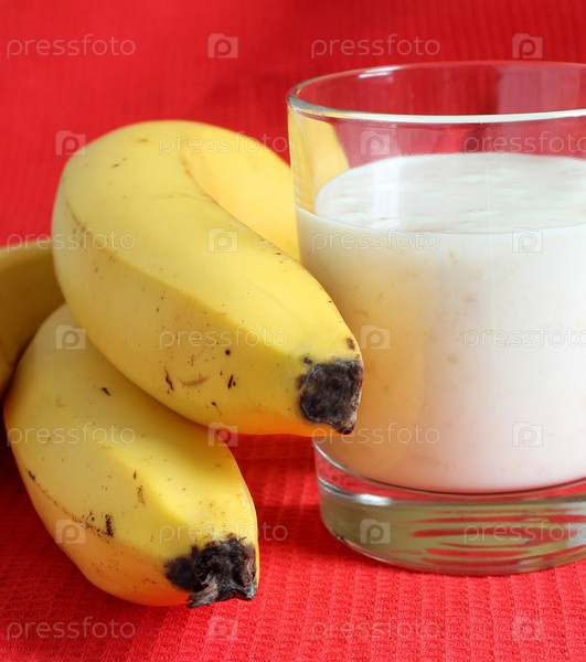 Стакан с йогуртом и бананы на красном фоне