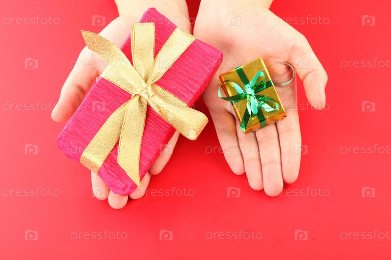 Подарочные коробочки в руках на красном фоне