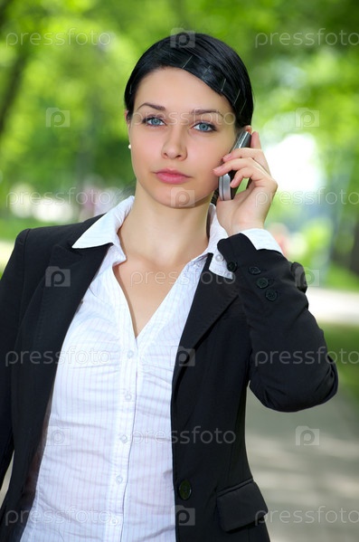 Красивая деловая женщина говорит по мобильному на свежем воздухе