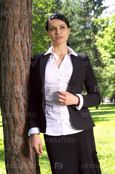 Красивая деловая женщина стоит, прислонившись к дереву в парке
